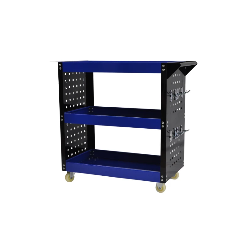Organizirajte svoj delovni prostor s tem profesionalnim servisnim vozičkom s 3 policami, izboljšano različico, ki vključuje perforirane kovinske stranske pladnje za večjo stabilnost in več uporabne površine za orodje. Zaradi kombinacije modre in črne barve ter robustne zasnove je praktična in funkcionalna rešitev za delavnice, garaže, vzdrževalne storitve in zahtevne navdušence.