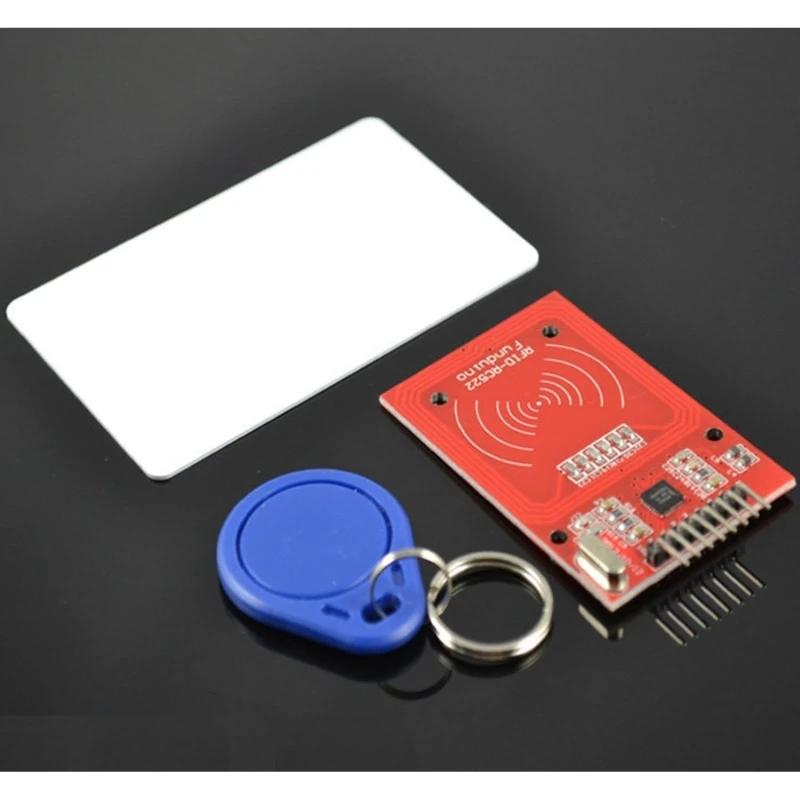 Paket vključuje modul RFID-RC522, standardno prazno IC kartico S50, posebno kartico v obliki obeska za ključe in ravni ter ukrivljeni pin header za povezavo.