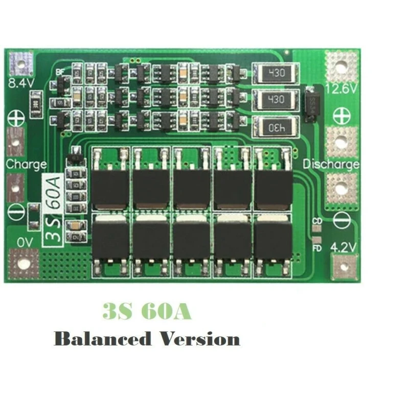 Ta zaščitna plošča je zasnovana za litijeve baterije v konfiguraciji 3S (tri celice zaporedno), z največjim neprekinjenim tokom praznjenja 60A in funkcijo uravnoteženega polnjenja. Je idealna rešitev za zaščito in optimizacijo delovanja baterij tipa 18650, 26650 in litij-polimernih baterij.