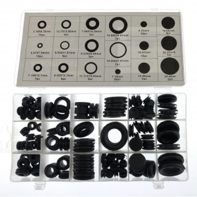 Komplet vsebuje kabelske uvodnice v 12 merah, na primer: 3,18 x 6,35 mm, 5,57 x 7,94 mm, 7,14 x 12,70 mm, do 19,05 x 23,81 mm, ter slepe čepe v 6 premerih od 7,14 mm do 25,4 mm. Količina po velikosti se razlikuje; podrobne informacije so navedene v opisu in pokrivajo večino standardnih odprtin v strojih in omaricah.